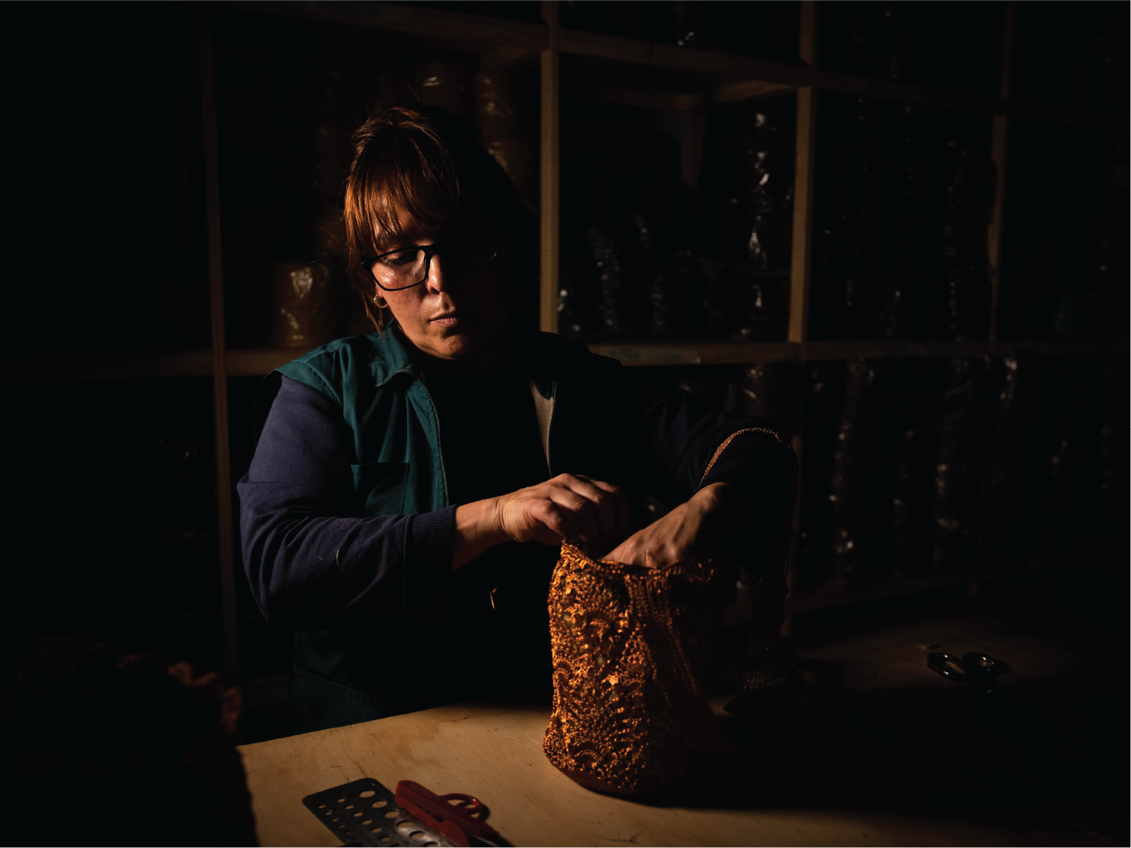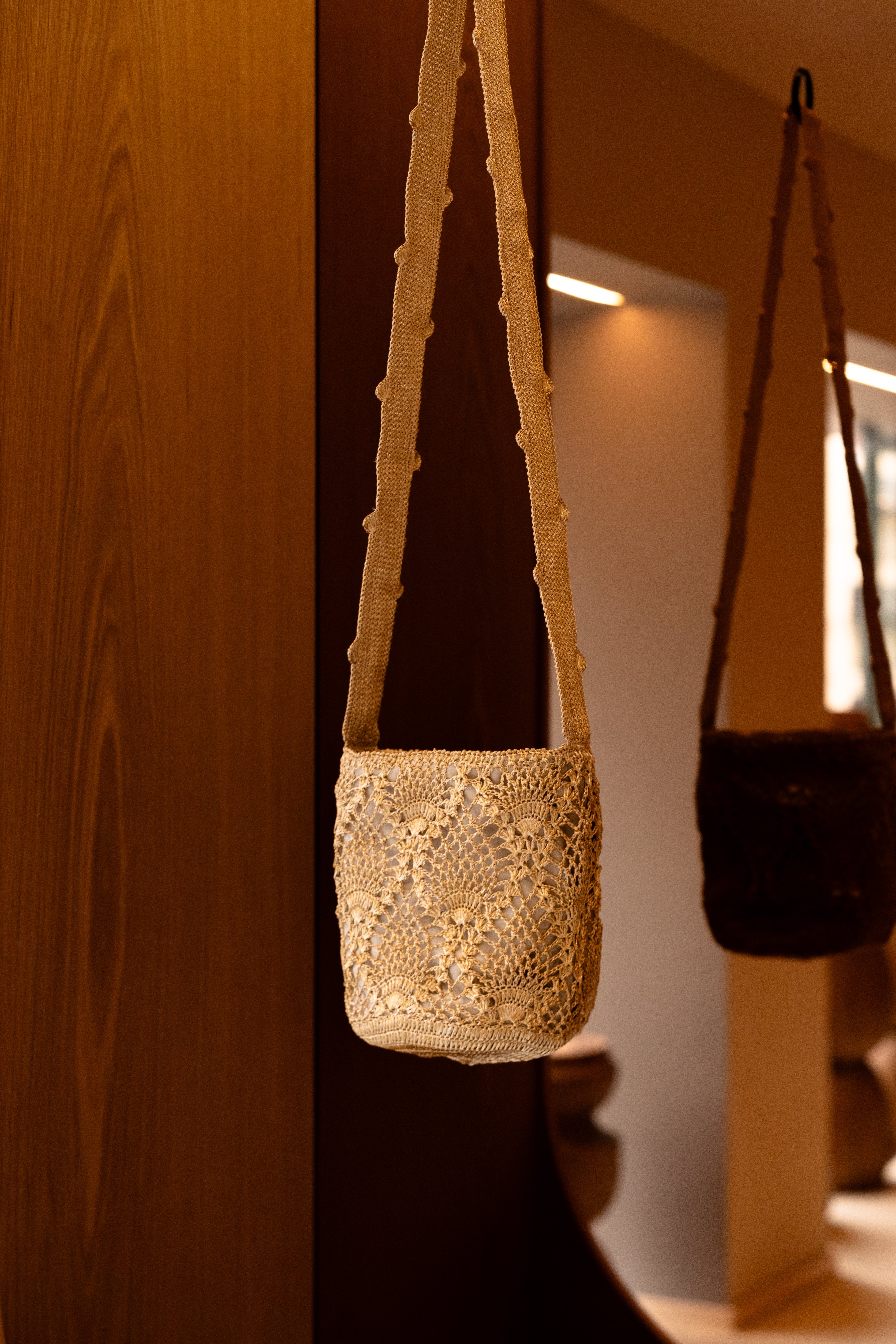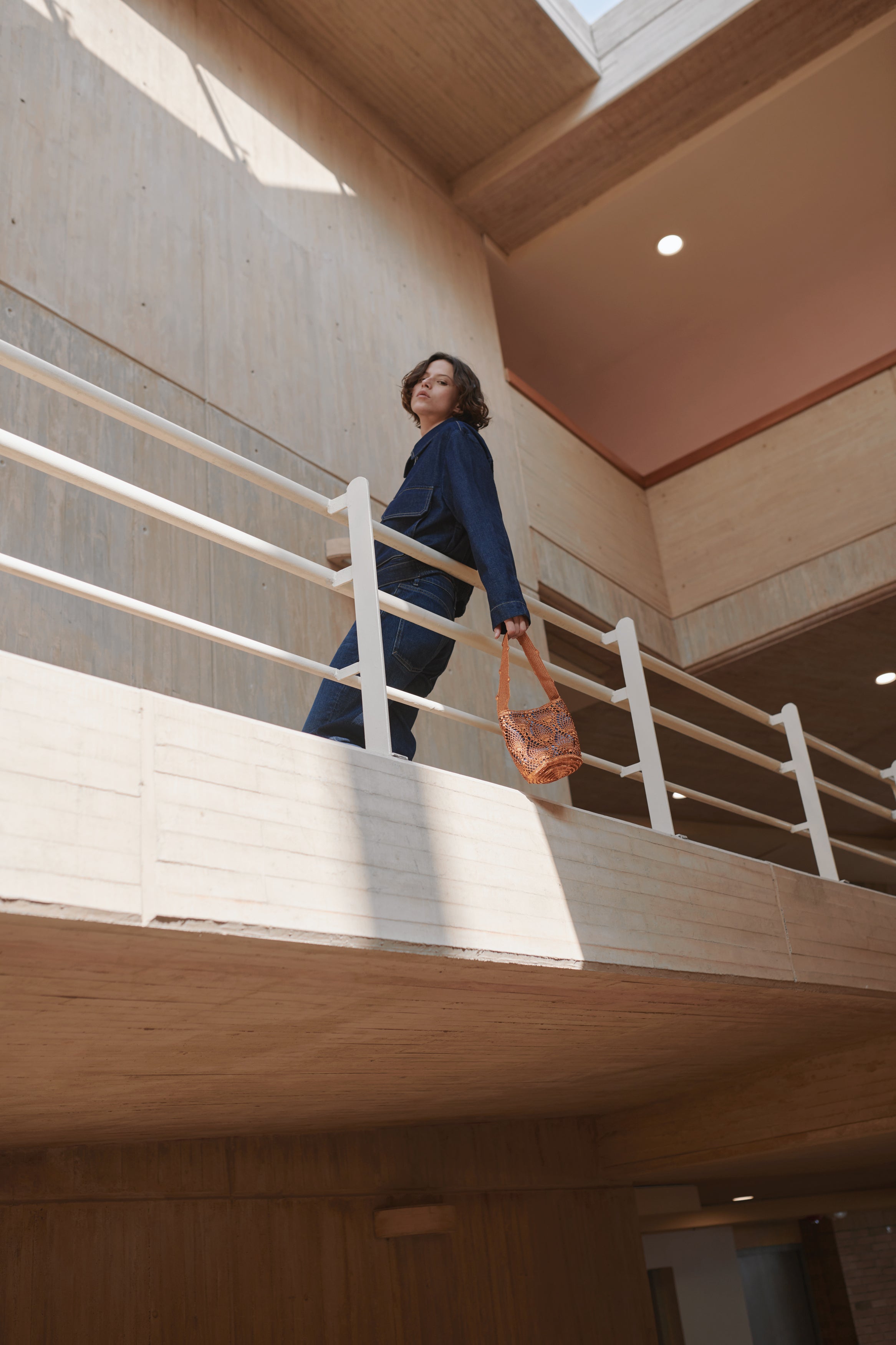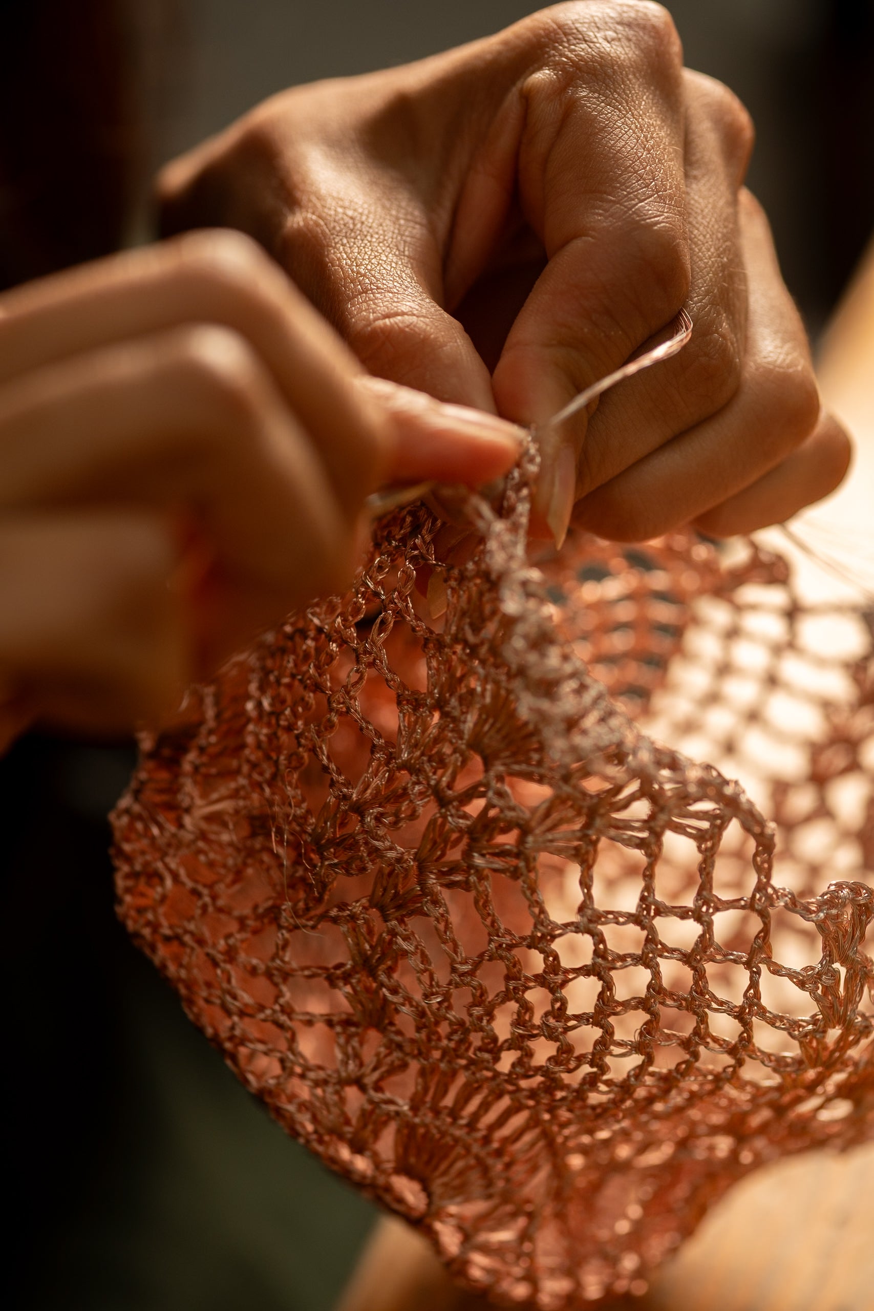 Vibrant and intricate, the Pineapple weave draws inspiration from the layered textures of Latin America’s fauna and flora, celebrating the richness of Colombian craftsmanship. Handwoven over 15 days by master artisans at The VERDI Atelier in Bogotá, each mochila intertwines copper and silver-plated metal threads into a richly textured, tactile surface. With its velvet-lined interior adding contrast and depth, the Pineapple Mochila transforms an ancestral technique into a contemporary statement of artistry, where structure and fluidity coexist in perfect harmony.