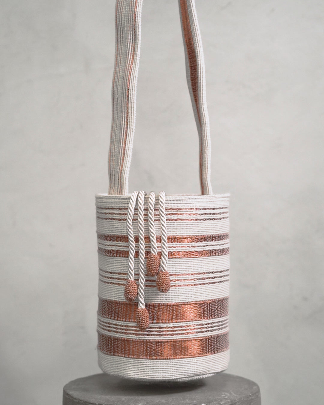 Handwoven mochila that pays homage to the grandeur and timeless allure of the Andean mountains. Handwoven in manual looms, this mochila is crafted in white alpaca and copper threads with a beige linen lining, a pouch and two interior pockets. It includes interchangeable straps.