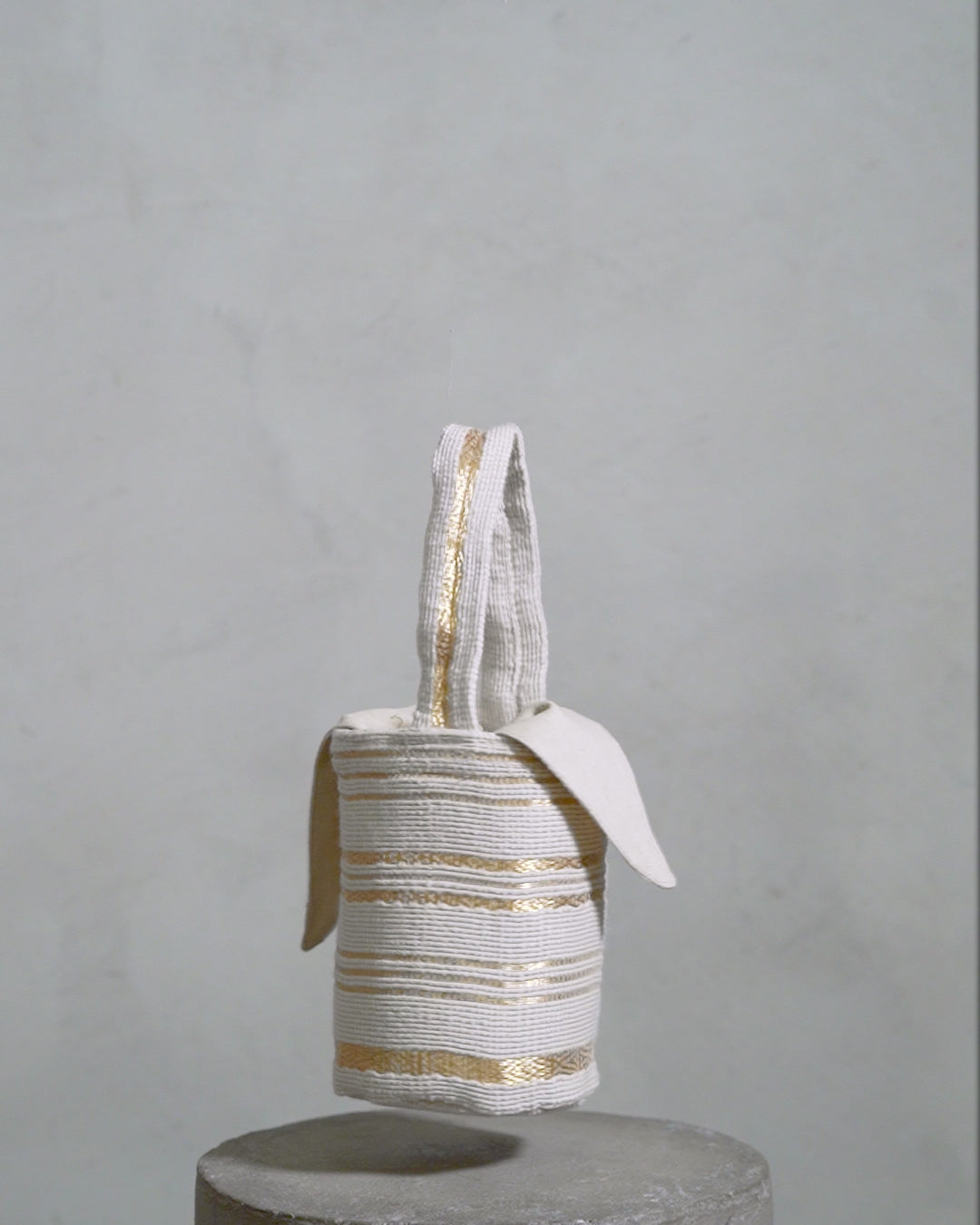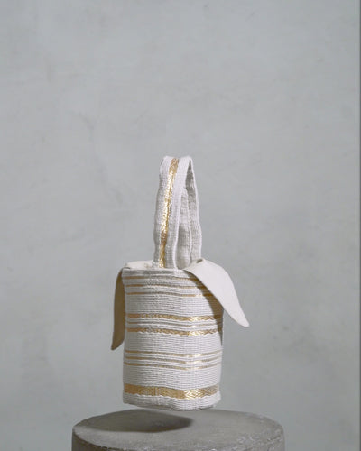 Handwoven mini mochila that pays homage to the grandeur and timeless allure of the Andean mountains. Handwoven in manual looms, this mochila is crafted in white alpaca and gold silver-plated metal threads with a beige linen lining.