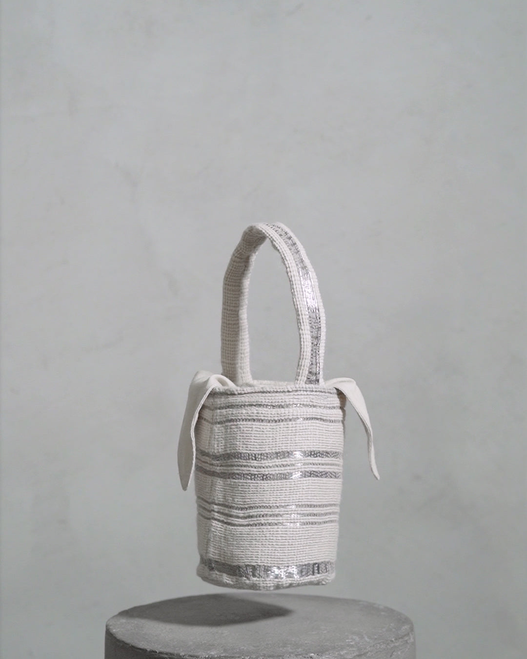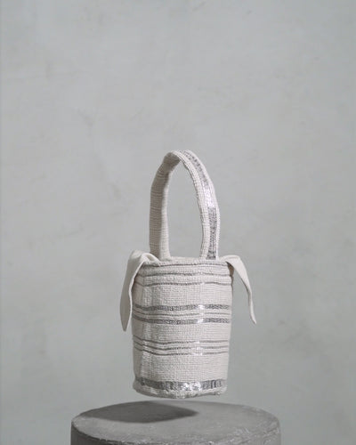 Handwoven mini mochila that pays homage to the grandeur and timeless allure of the Andean mountains. Handwoven in manual looms, this mochila is crafted in white alpaca and silver-plated metal threads with a beige linen lining.