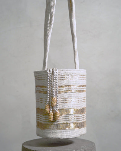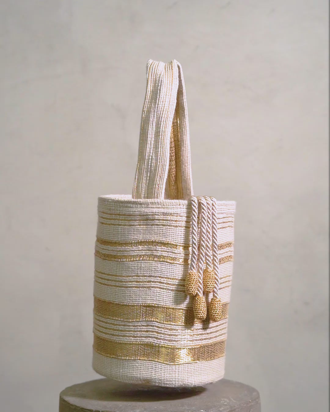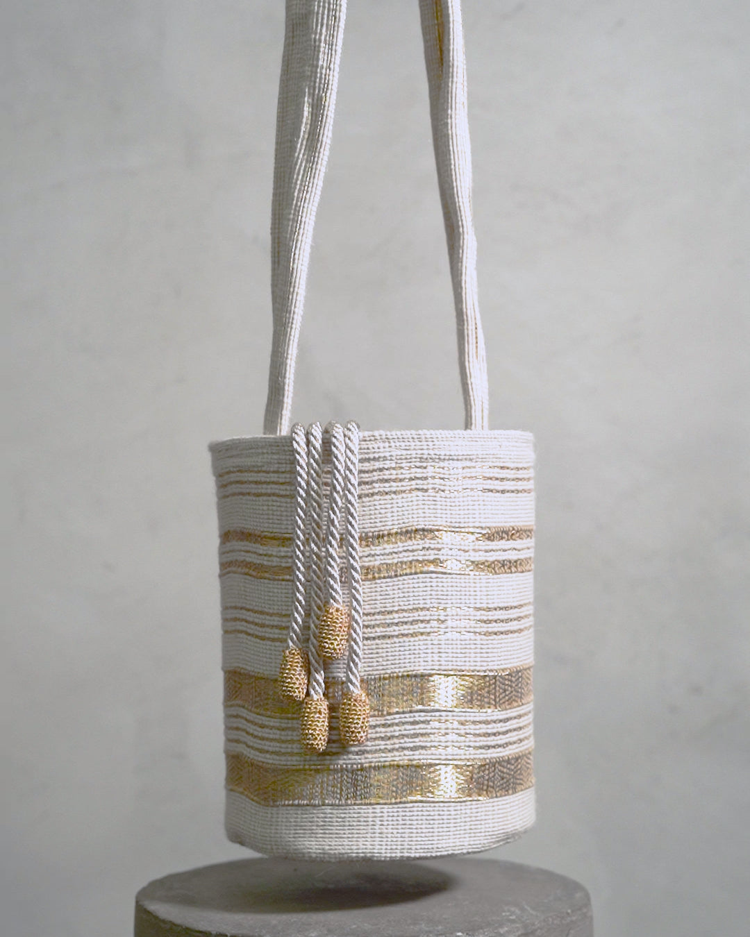 Handwoven mochila that pays homage to the grandeur and timeless allure of the Andean mountains. Handwoven in manual looms, this mochila is crafted in white alpaca and gold silver-plated metal threads with a beige linen lining, a pouch and two interior pockets. It includes interchangeable straps.