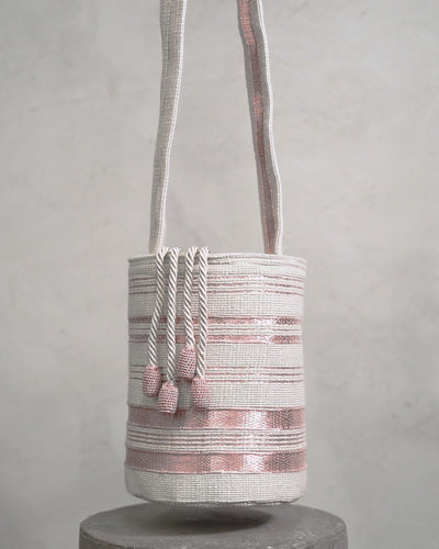 Handwoven mochila that pays homage to the grandeur and timeless allure of the Andean mountains. Handwoven in manual looms, this mochila is crafted in white alpaca and rose gold silver-plated metal threads with a beige linen lining, a pouch and two interior pockets. It includes interchangeable straps.