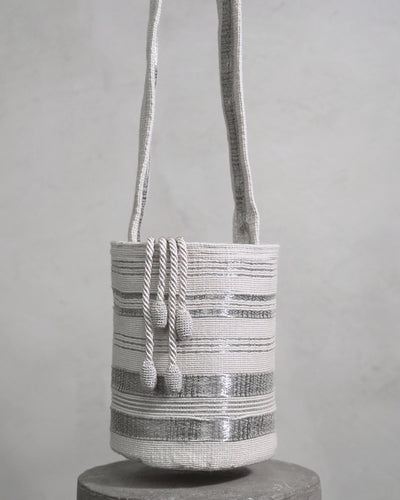 Handwoven mochila that pays homage to the grandeur and timeless allure of the Andean mountains. Handwoven in manual looms, this mochila is crafted in white alpaca and silver-plated metal threads with a beige linen lining, a pouch and two interior pockets. It includes interchangeable straps.