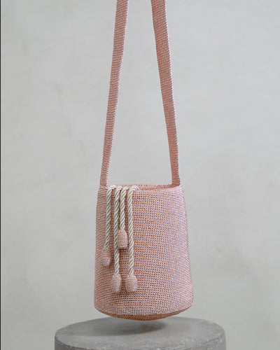 Handwoven mochila in a nido weave that reinterprets the traditional Colombian bag into a modern timeless accessory. This mochila is crafted in rose gold silver-plated metal threads with a beige linen lining, a pouch and two interior pockets.