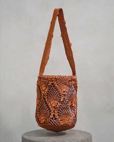 Handwoven mochila in a pineapple weave inspired by the vibrant fauna and flora of Latin America. This mochila is crafted in copper threads with a blue velvet lining, two internal pockets and a magnetic closure.