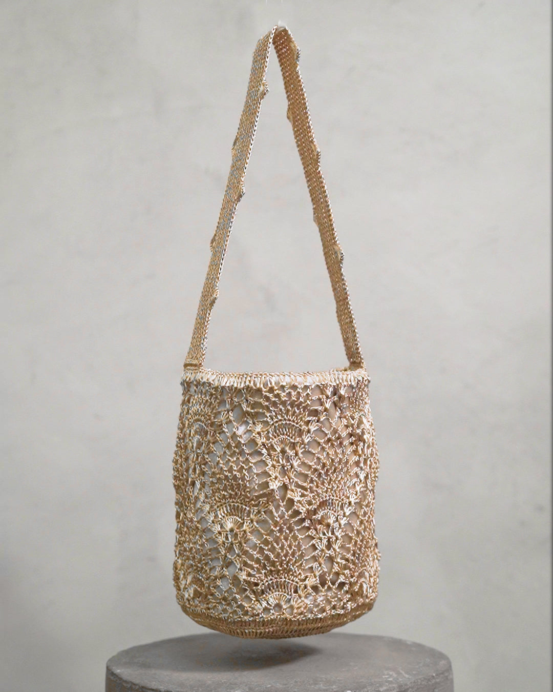Vibrant and intricate, the Pineapple weave draws inspiration from the layered textures of Latin America’s fauna and flora, celebrating the richness of Colombian craftsmanship. Handwoven over 15 days by master artisans at The VERDI Atelier in Bogotá, each mochila intertwines copper and silver-plated metal threads into a richly textured, tactile surface. With its velvet-lined interior adding contrast and depth, the Pineapple Mochila transforms an ancestral technique into a contemporary statement of artistry, where structure and fluidity coexist in perfect harmony.