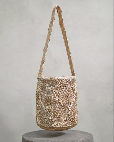 Handwoven mochila in a pineapple weave inspired by the vibrant fauna and flora of Latin America. This mochila is crafted in gold silver-plated metal threads with a beige velvet lining, two internal pockets and a magnetic closure.