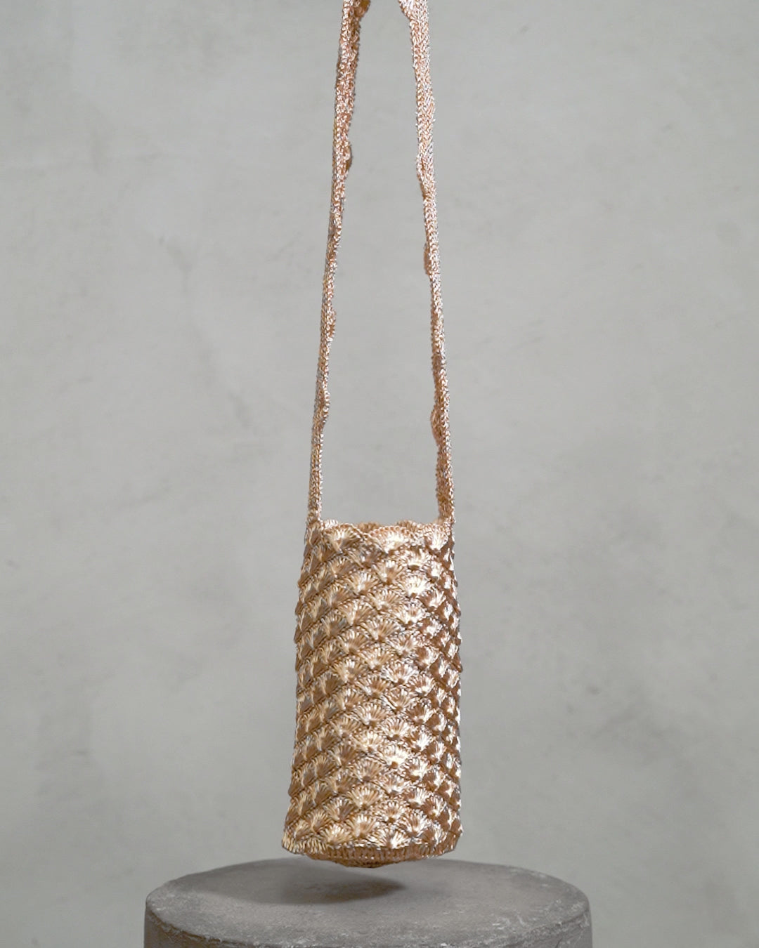 Handwoven mochila in a seashell weave that symbolizes nature, strength, and the infinite legacy that has passed through generations of Colombian artisans. This mochila is crafted in gold silver-plated metal threads with a beige linen lining.