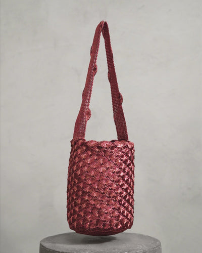 Handwoven mochila in a seashell weave that symbolizes nature, strength, and the enduring legacy passed down through generations of Colombian artisans. This mochila is crafted in copper and magenta metal threads, capturing the fiery transformation of raw copper as it succumbs to heat. Finished with an emerald lining, two interior pockets, and a magnetic closure.