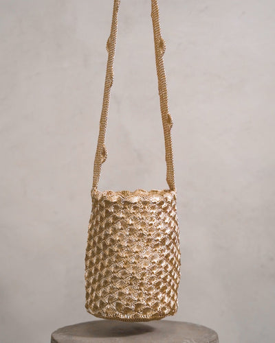 Handwoven mochila in a seashell weave that symbolizes nature, strength, and the infinite legacy that has passed through generations of Colombian artisans. This mochila is crafted in gold silver-plated metal threads with a beige linen lining, two interior pockets and a magnetic closure.