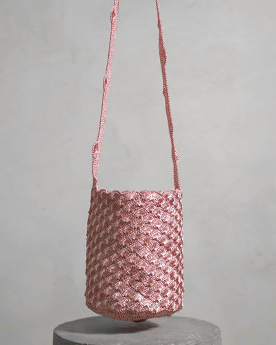 Handwoven mochila in a seashell weave that symbolizes nature, strength, and the infinite legacy that has passed through generations of Colombian artisans. This mochila is crafted in rose gold silver-plated metal threads with a beige linen lining, two interior pockets and a magnetic closure.