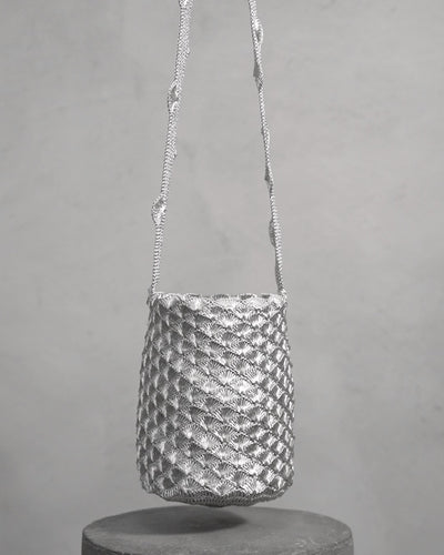 Handwoven mochila in a seashell weave that symbolizes nature, strength, and the infinite legacy that has passed through generations of Colombian artisans. This mochila is crafted in silver-plated metal threads with a beige linen lining, two interior pockets and a magnetic closure.