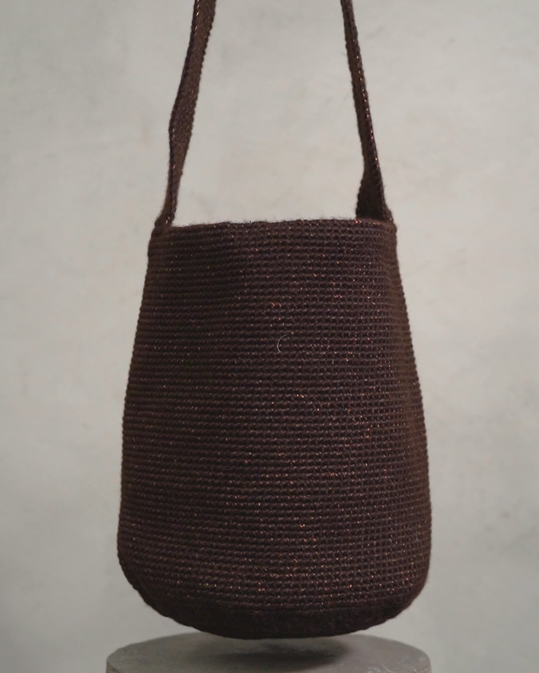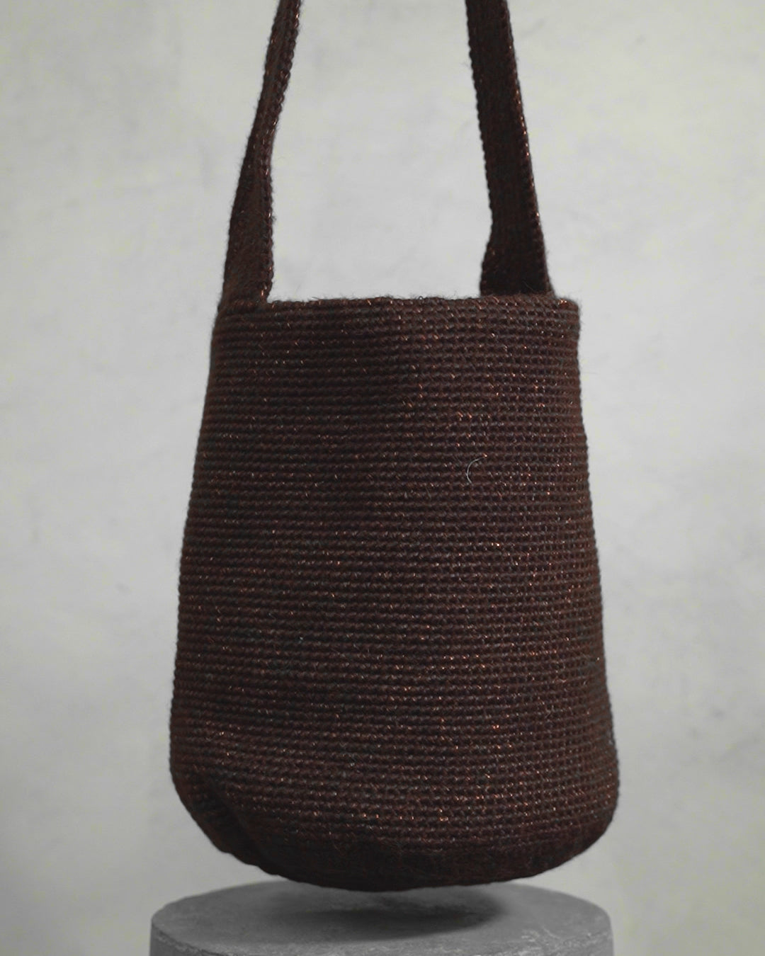 Handwoven mochila in a traditional weave that embodies the best of Latin American materials by intertwining threads of Peruvian Baby Alpaca, Chilean Copper, and Colombian Organic Silk. This mochila is crafted in brown alpaca, copper threads and brown silk, with a brown linen lining, two interior pockets, and a magnetic closure.