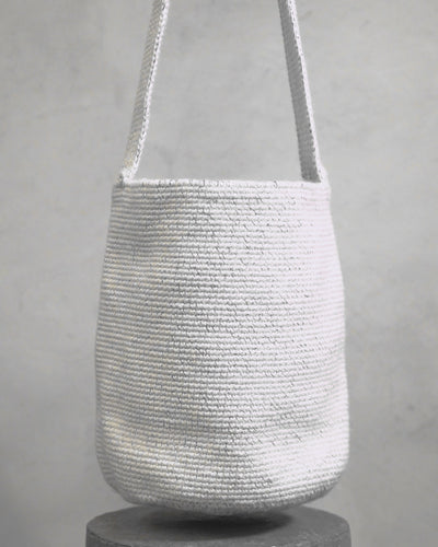 Handwoven mochila in a traditional weave that embodies the best of Latin American materials by intertwining threads of Peruvian Baby Alpaca, Chilean Copper, and Colombian Organic Silk. This mochila is crafted in white alpaca, copper threads and white silk, with a beige linen lining, two interior pockets, and a magnetic closure.
